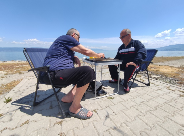Burada sıkı dostluklar kuran karavancılar, araçlarının önüne kurdukları masalarda dostlarıyla denize karşı tavla oynayıp keyifli vakit geçiriyor.