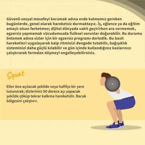 Güvenli sosyal mesafeyi korumak adına evde kalması gereken bugünlerde, hareketsiz bir yaşam tarzı da ister istemez insan yaşantısına iş, eğlence ya da eğitim amaçlı olarak dijital dünyada daha fazla zaman geçirdiği bu süreçte, ara vermemek, egzersiz yapmamak vücudunda çeşitli fiziksel sorunlara neden olabiliyor. Bu noktada, Anadolu Üniversitesi evde yapılabilecek bazı basit spor egzersizleri öneriyor. Bu egzersizleri düzenli şekilde uygulayarak kalp ritminizi dengede tutabilir, bağışıklık sisteminizi daha güçlü kılabilir ve gün içinde kullandığınız kaslarınızı çalıştırarak formdan düşmeyi engelleyebilirsiniz.