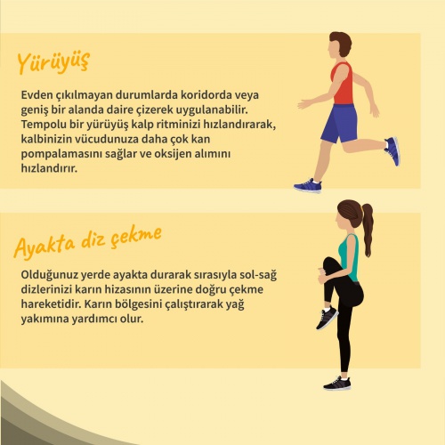 Evden çıkılmayan durumlarda koridorda veya geniş bir alanda daire çizerek uygulanabilir. Tempolu bir yürüyüş kalp ritminizi hızlandırarak, kalbinizin vücudunuza daha çok kan pompalamasını sağlar ve oksijen alımını hızlandırır.