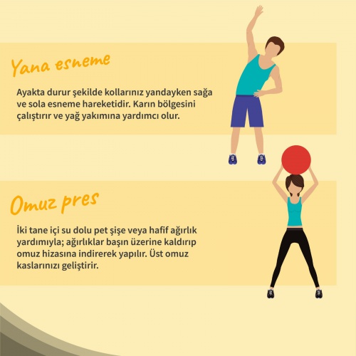 İki tane içi su dolu pet şişe veya hafif ağırlık yardımıyla; ağırlıklar başın üzerine kaldırıp omuz hizasına indirerek yapılır. Üst omuz kaslarınızı geliştirir.