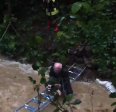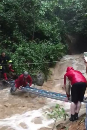 İtfaiye ekiplerinin debisi yükselen dere üzerine kurduğu merdiven köprü yardımı ile yaşlı çift bulundukları yerden kurtarılarak evlerine götürüldü. O anlar cep telefonu kameralarına yansıdı.