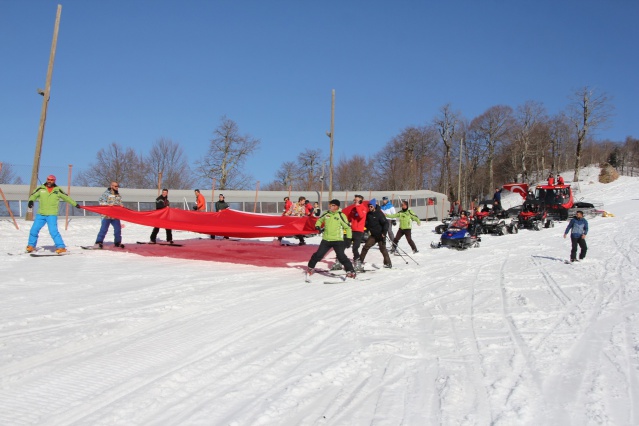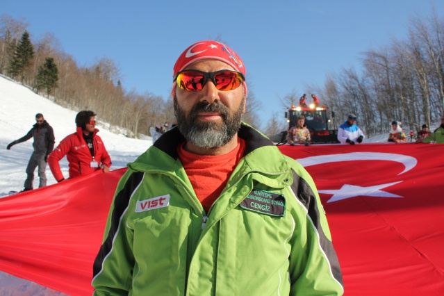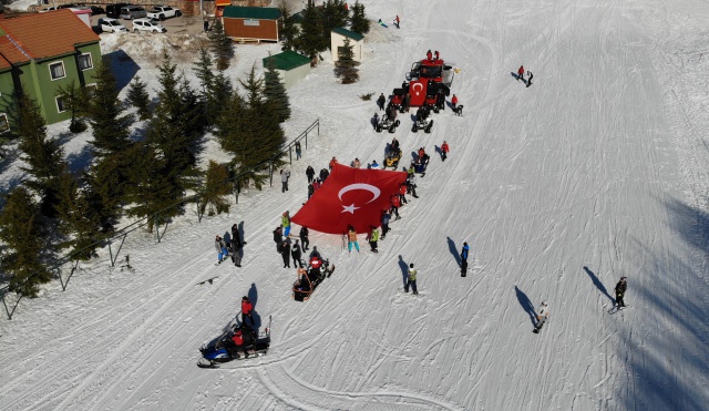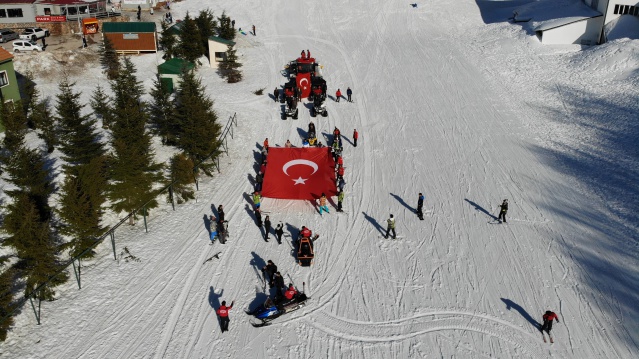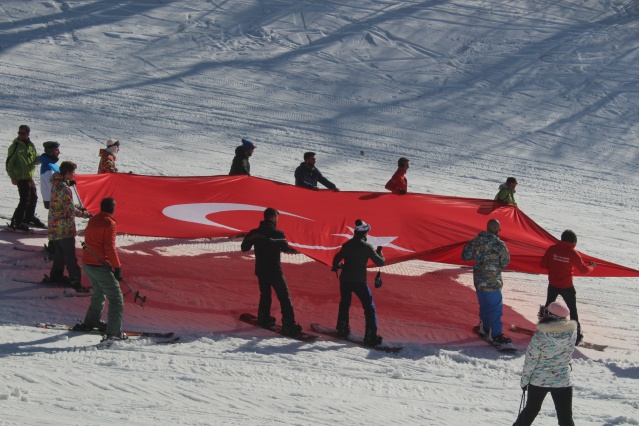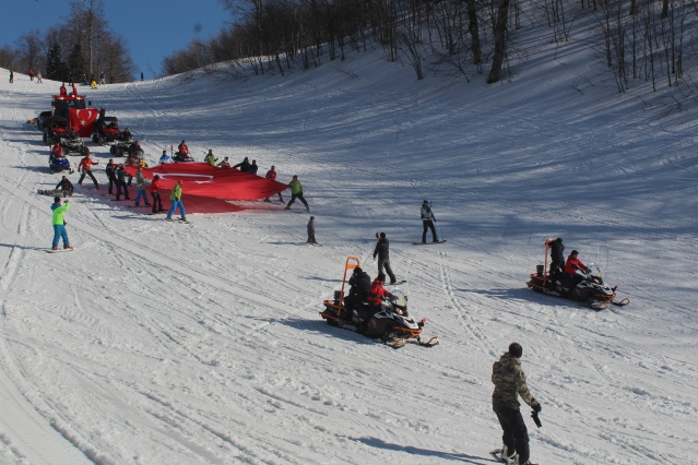 Yaklaşık uzunluğu 2 bin 500 metre olan pistte toplanan kayak tutkunları dev Türk bayrağını açarak etrafında toplandı. Kayak tutkunlarına JAK timleri ve kayak merkezi çalışanları da kar motorları ve paletli kar araçları ile eşlik etti.