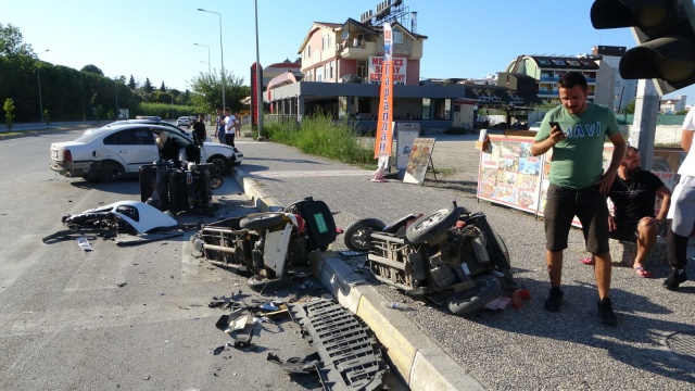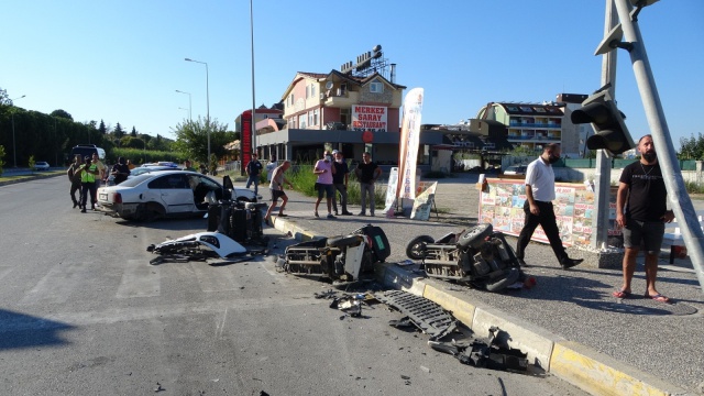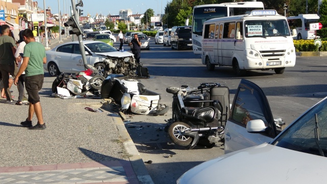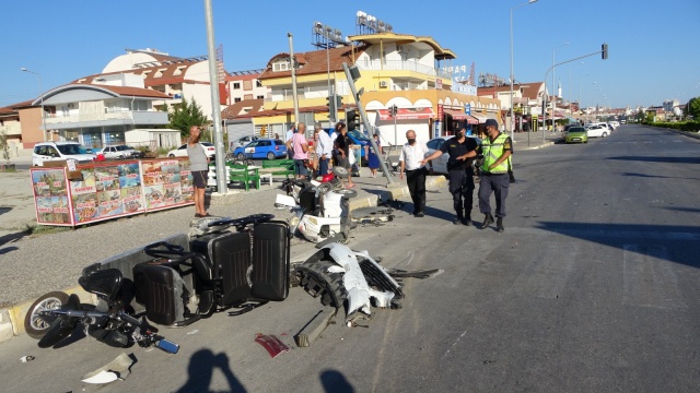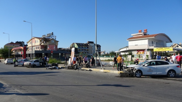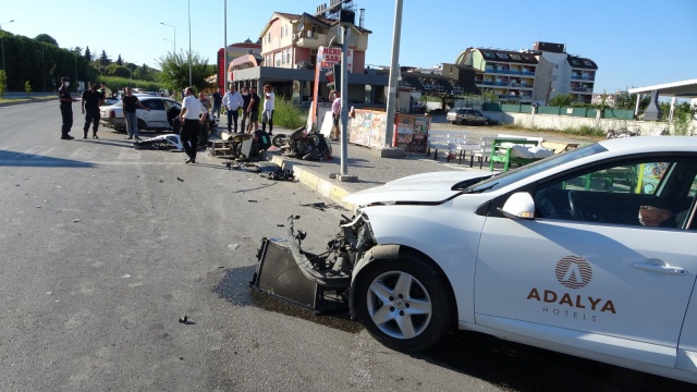 Kaza yapan 42 AAN 94 plakalı araç, çarpışmasının şiddetiyle turistlere kiraya verilmek üzere yol kenarında park halinde bulunan ve bir rent a-car firmasına ait olduğu belirlenen 3 adet elektrikli motosiklete çarpt