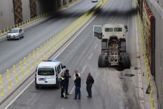Konya’da seyir halindeki kamyonun açılan damperli kasasının alt geçide çarpması sonucu damperli kasa şasiden ayrılıp düşerken, kamyon ise metrelerce ileride durabildi.