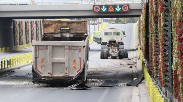 Damperli kasası açılan kamyon alt geçide çarparak ikiye ayrıldı. Ortaya çıkan görüntü ilk bakışta herkesi şoke etti