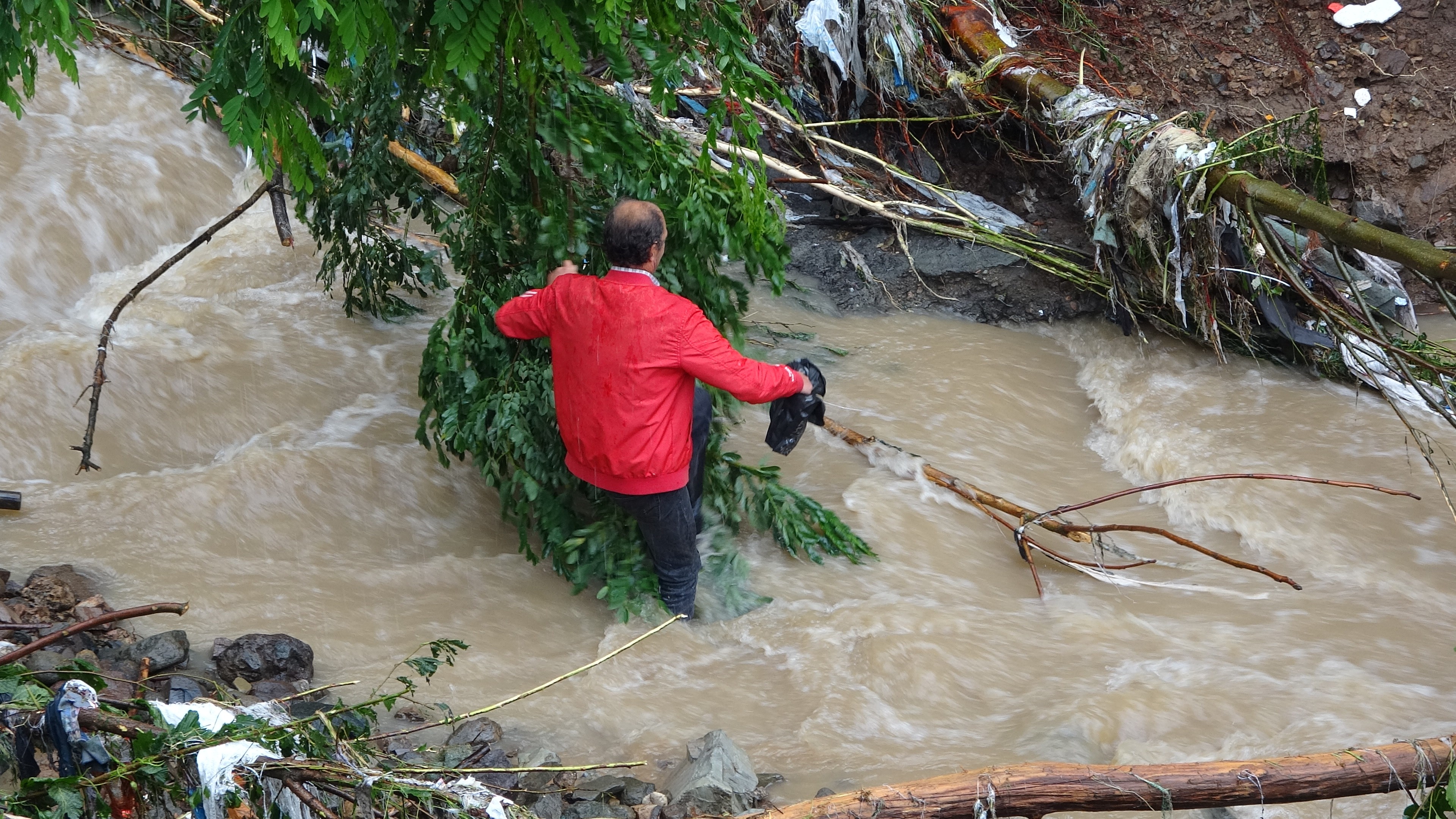 Evine gitmek için farklı bir yolu olmadığını ifade eden Mehmet Dursun, dere yatağına inerek, çizmelerini çıkarttı, sonrasında ise sel suları ile şiddetini arttıran dereden karşıya geçti.