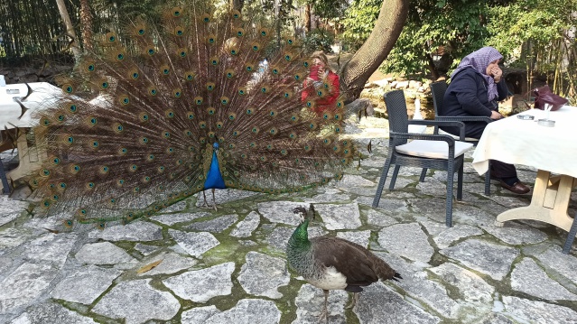 Hemen hemen her evin çatısında, ya da balkonunda görülmeye başlanan kuşlar için sitenin bir çok yerinde su ve ekmek kapları bulunuyor. Balkon ya da çatılardan birbirlerine seslenen tavus kuşları metrelerce ileriden bulundukları yerleri birbirlerine haber veriyor. Kuşların her sabah 7’de kafenin bahçesindeki yaşlı