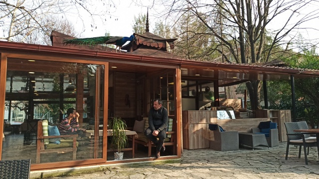 Manisa'nın Yunusemre ilçesi Güzelyurt Mahallesindeki Barış Alanı Öncü Sitesi içerisinde kafe işleten Okan Evren, 15 sene önce iş yerine renk olsun diye bir erkek tavus kuşu aldı.