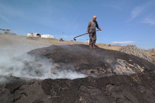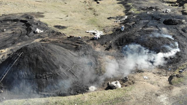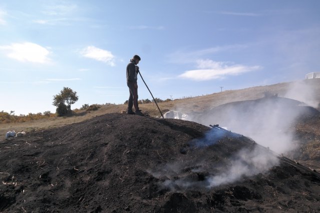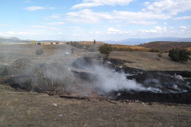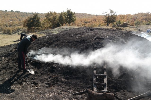 Hazır hale gelmesi en az 40-50 gün arasında sürüyor. Öncelikle odunları kesiyoruz. Bu da en az 20-30 gün sürüyor. Ondan sonra o odunları topluyorsun. 20 römorkla bir ocak oluşuyor. Odunları dizdikten sonra üzerine samanla örtüyoruz. Sonra bunun üstüne toprak atıyoruz. Ocağın üst tarafından içeriye ateş bırakıyoruz. Ateş yavaş yavaş aşağıya doğru iniyor. Bu toprağın altında en az en uzun 30 en kısa 15 günde çıkıyor. Yani 2 haftalık bir süreçten sonra kömür çıkıyor. En az 2 hafta durmadan yanıyor. Yanma süreci bittiği zaman naylonla sararak 1 hafta bekletiyoruz. Soğuyunca da yavaş yavaş çıkartıyoruz” dedi.