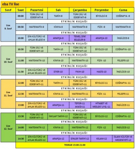 Milli Eğitim Bakanlığı, Kovid-19 tedbirleri kapsamında eğitime verilen arada ilkokul, ortaokul ve lise öğrencilerine verilecek uzaktan eğitim ile ilgili ders programını açıkladı. Derslerin 20 dakika süreceğini açıklayan Milli Eğitim Bakanı Ziya Selçuk, ilk dersi de kendisi verecek. ‘EBA TV' kanalı adı altında yapılacak uzaktan eğitim programı kapsamında dersler sabah 09.00'da başlayacak. Dersleri kaçıranlar ya da tekrar izlemek isteyenler için ‘EBA TV' de belirli saatlerde tekrarlar yapılacak.