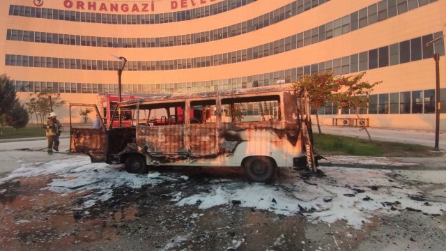 Bursa'nın Orhangazi ilçesinde yaşlı çiftin hastane bahçesine park edip içerisinde uyuduğu minibüs alev alev yandı.