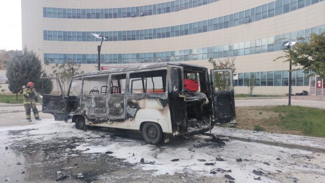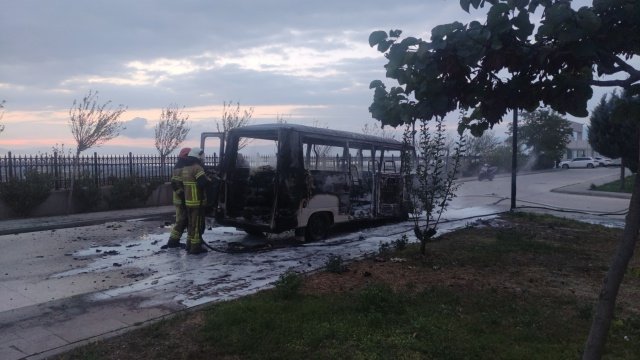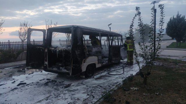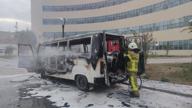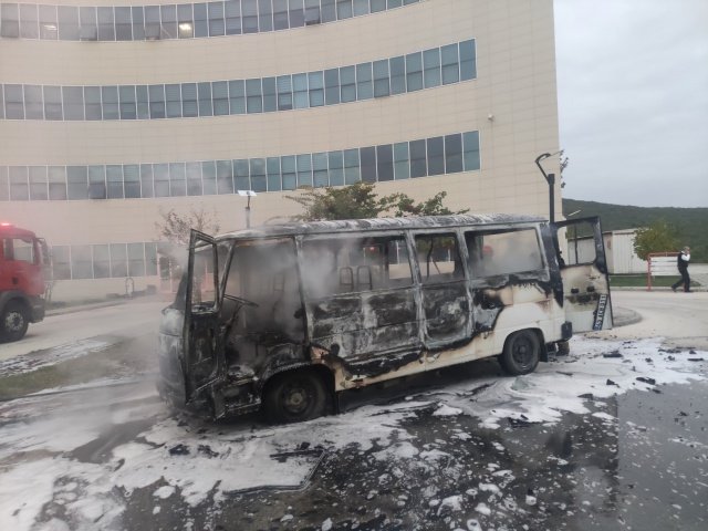 Uyandıklarında minibüsün alev aldığını farkeden yaşlı çift son anda minibüsten inmeyi başardılar. Hastane personelinin haber vermesi ile olay yerine gelen itfaiye ekipleri alev topuna dönen minibüsü söndürdü.