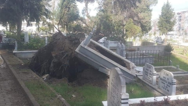 Şiddetli rüzgar ve fırtına nedeniyle Altınordu ilçesindeki Şahincili Şehir Mezarlığı’nda bulunan yaklaşık 10 ağaç yıkıldı. Bazı ağaçların kökünden devrildiği olay sonrası mezarlıkta bulunan yaklaşık 15 mezar tahrip oldu