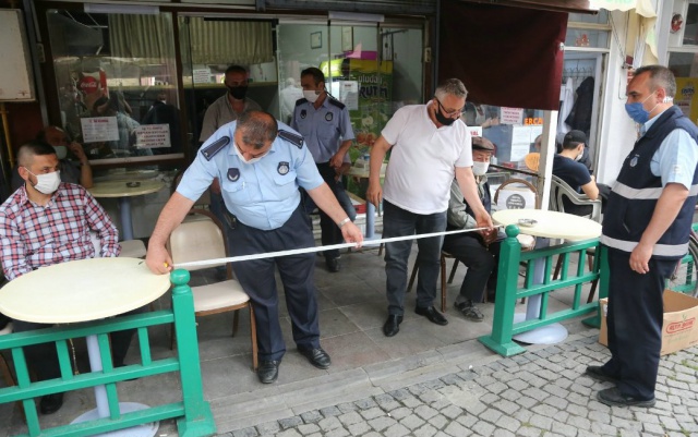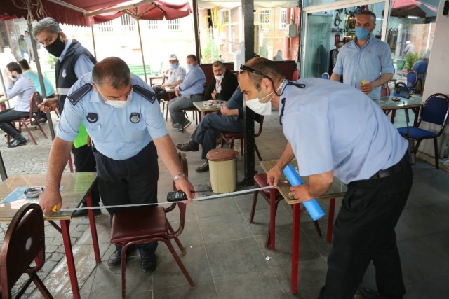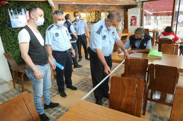 Özellikle iş yerlerinde ateş ölçer ve dezenfektan bulundurulmasını kontrol eden ekipler, masalar arasında 1,5 metre olması gereken sosyal mesafeyi ölçerek kurala uymayan iş yerlerini uyardı.