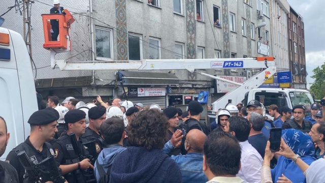 Evden çıkmamak için direnen vatandaşlarla güvenlik güçleri arasında arbede yaşandı. Bu sırada bir kadının camdan polisin üzerine su döktüğü görüldü.