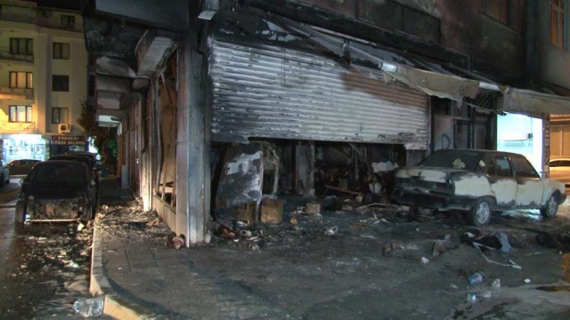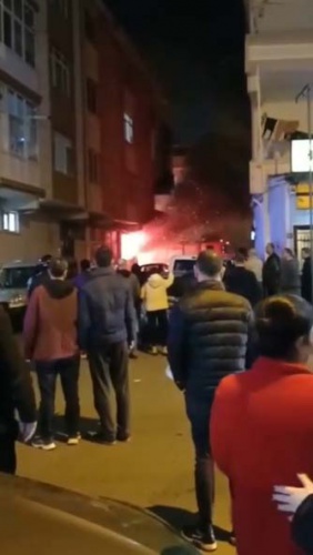 Görüntülerde, iş yerinin alevler içinde yandığı, çevredeki vatandaşların olaya müdahale etmeye çalıştığı ve olay yerine itfaiye ekiplerinin geldiği görülüyor.