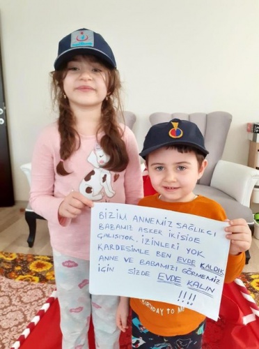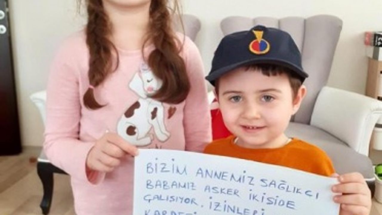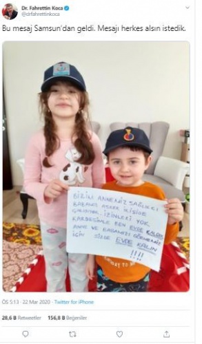 Kardeşlerin yazdığı mesajda, “Bizim annemiz sağlıkçı babamız asker. İkisi de çalışıyor. İzinleri yok. Kardeşimle ben evde kaldık. Anne ve babamızı görmemiz için sizde evde kalın” ifadeleri yer aldı. Bakan Koca kardeşlerin verdiği bu mesajı, “Bu mesaj Samsun’dan geldi.