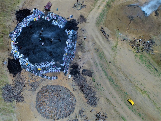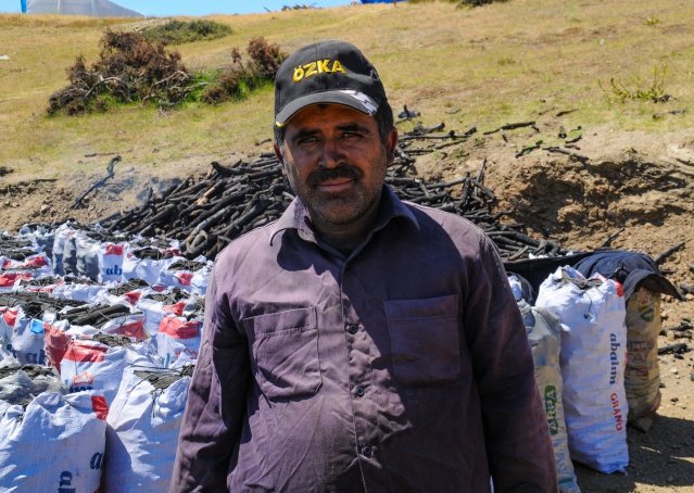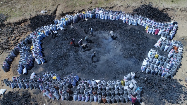 Diyarbakır’dan Eskişehir’in Sarıcakaya ilçesindeki Bey Yaylası’na gelen mevsimlik işçiler, meşe odunlarından mangal kömürü üretiyor.