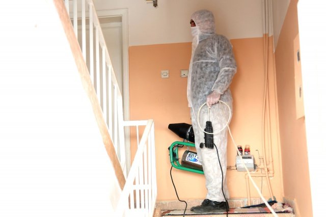 6 kişinin yaşadığı bina, ekipler tarafından girişinden başlayarak dezenfekte edildi.