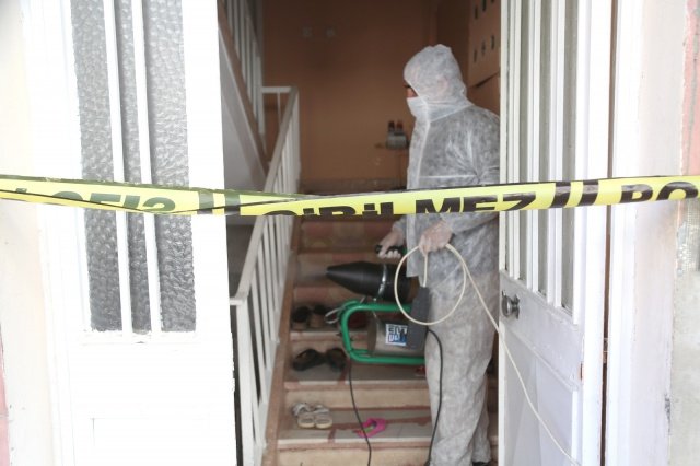 Sümer Mahallesi'nde iki kişide koronavirüsü tespit edilmesi sonrasında dün karantina altına alınan binada 6 kişinin karantinası sürüyor. Belediye ekipleri tüm binayı dezenfekte etti. İşte son görüntüler...