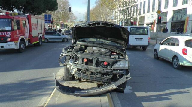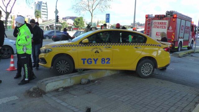 Ticari taksi çarpışmanın etkisiyle yola savrulurken otomobil ise yol üzerindeki direği devirerek orta refüje çıktı.