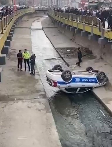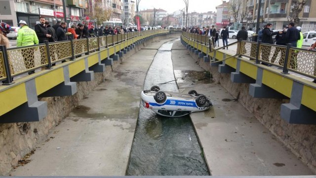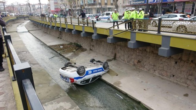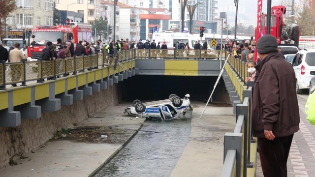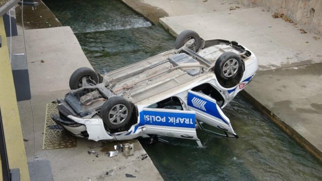 Edinilen bilgiye göre, kaza, Behzat Bulvarı pazar kavşağında meydana geldi. Mustafa Y. idaresindeki Hundai marka trafik polisi aracı sürücüsünün direksiyon hakimiyetini kaybetmesi sonucu korkuluklara çarparak dereye uçtu.