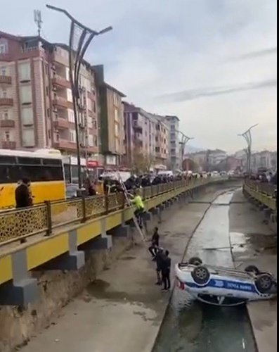 Yaklaşık 3 metre yükseklikten dereye uçan otomobil ters döndü. Su seviyesinin oldukça düşük olduğu dereye vatandaşlar atlayarak yardıma koştu. Olay yerine sevk edilen itfaiye ekipleri tarafından yaralanan polis memuru merdiven yardımı ile çıkarıldı.