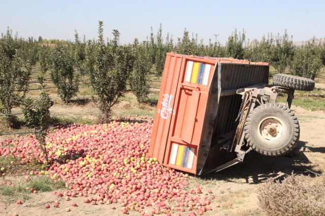 Karaman’da devrilen elma yüklü traktörün sürücüsü kazayı hafif sıyrıklarla atlattı.