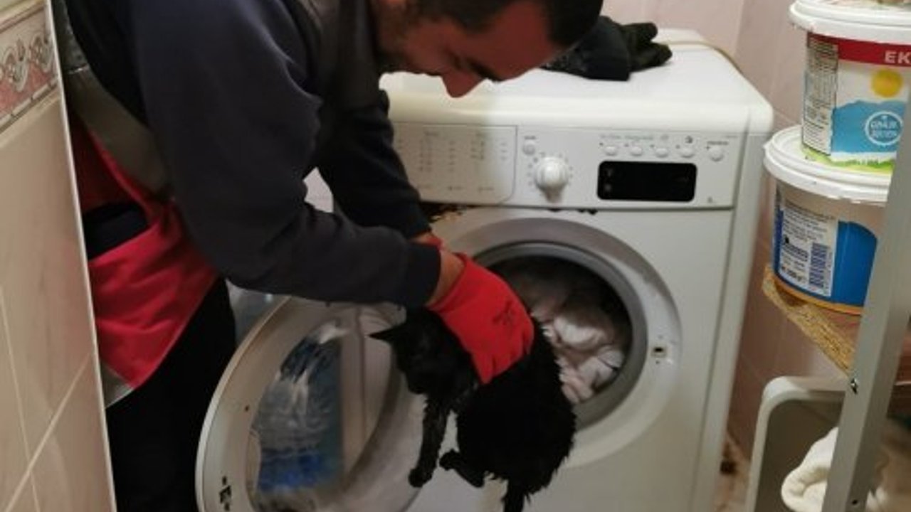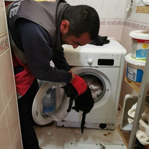 Durumun sonradan fark edilmesinin ardından çamaşır makinesinde mahsur kalan yavru kediyi itfaiye ekipleri kurtardı.