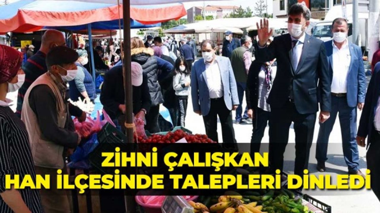 Zihni Çalışkan ve beraberindeki Han ilçesi pazarında da vatandaşları dinledi. Çalışkan, "Han ilçemizde pazarcı esnafımız ve hemşehrilerimizle bir araya gelerek sohbet etme fırsatı bulduk. Hemşehrilerimizin ve pazarcı esnafımızın sıkıntılarını dinleyerek çözüm önerilerimizi konuştuk" diye konuştu.