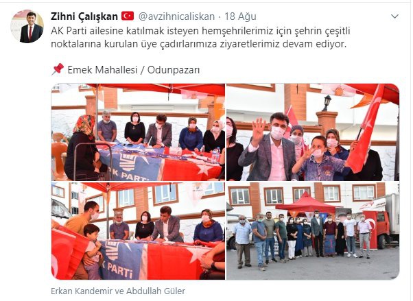 AK Parti Eskişehir İl Başkanı Zihni Çalışkan, 18 Ağustos'ta AK Parti'ya vatandaşların üye olması için kurulan üyelik çadırlarını ziyaret ettiğini duyurmuştu. Fotoğraflarda maskeli görülen Zihni Çalışkan, burada çok sayıda vatandaşla görüşmüştü...
