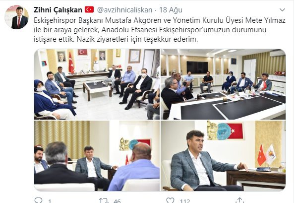 AK Parti Eskişehir İl Başkanı Zihni Çalışkan, 18 Ağustos'ta Eskişehirspor'u da ziyaret etmişti... Ziyarette, Eskişehirspor Başkanı Mustafa Akgören ve Yönetim Kurulu Üyesi Mete Yılmaz ile bir araya gelen Çalışkan, Eskişehirspor’un durumunu istişare ettiklerini belirtmişti...