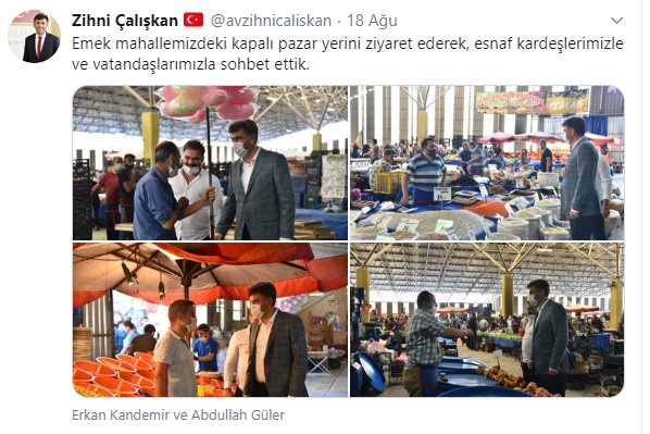 AK Parti Eskişehir İl Başkanı Zihni Çalışkan, 18 Ağustos'ta Emek Kapalı Pazaryeri'ni de ziyaret etmiş ve çok sayıda pazarcı esnafı ve vatandaş ile bir araya gelmişti...