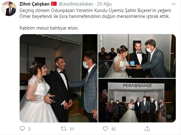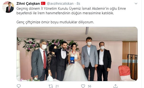AK Parti Eskişehir İl Başkanı Zihni Çalışkan, 22 Ağustos'ta ayrıca bir düğüne daha katılmıştı... 22 Ağustos akşamı Zihni Çalışkan'ın koronavirüs testinin pozitif çıktığının ve evinde karantinada olduğunun açıklanması Eskişehir'de şok etkisi yaratmıştı...