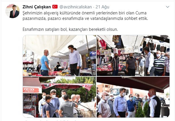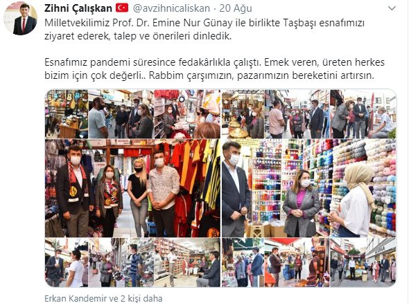 AK Parti Eskişehir İl Başkanı Zihni Çalışkan, ayrıca 20 Ağustos'ta AK Parti Eskişehir Milletvekili Prof.Dr. Emine Nur Günay ile birlikte Eskişehir esnafını ziyaret etmişti. Çalışkan, Köprübaşı ve Taşbaşı çevresinde çok sayıda esnaf ile görüşmüştü...