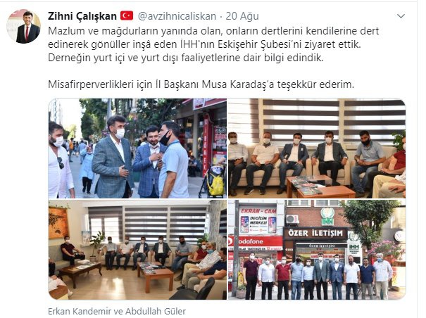 AK Parti Eskişehir İl Başkanı Zihni Çalışkan, 20 Ağustos'ta İHH Eskişehir Şubesi'ni ziyaret etmişti..