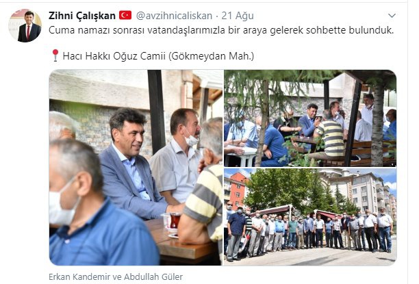 AK Parti Eskişehir İl Başkanı Zihni Çalışkan, 21 Ağustos'ta Hacı Hakkı Oğuz Camii'nde (Gökmeydan Mah.) cuma namazı sonrasında vatandaşlarla sohbet etmişti...