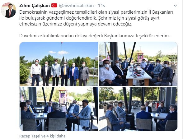 AK Parti Eskişehir İl Başkanı Zihni Çalışkan'ın sosyal medya paylaşımlarına göre, 17 Ağustos'ta AK Parti haftalık olağan yürüme kurulu toplantısı gerçekleştirilmişti. Toplantıyla ilgili açıklamada, toplantıda maske ve sosyal mesafe kurallarına uyulduğu özellikle vurgulanmıştı...