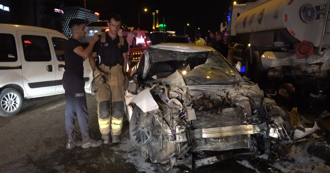 Bursa’da bir otomobil çimleri sulayan sulama tankerine arkadan çarptı. 4 aracın karıştığı feci kazada 1'i ağır 5 kişi yaralandı.