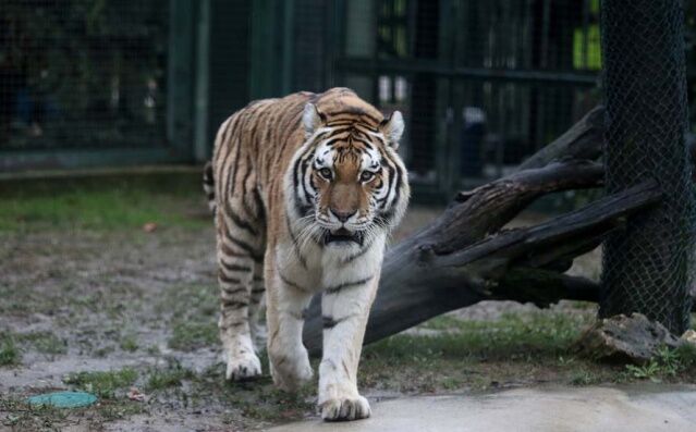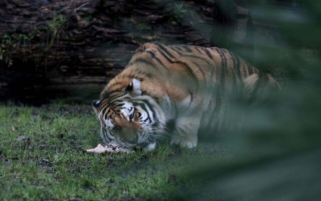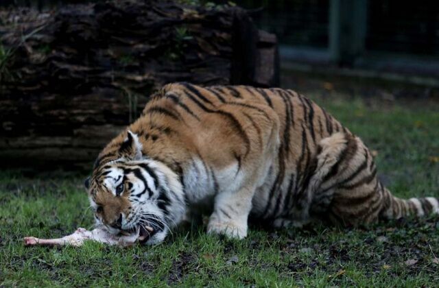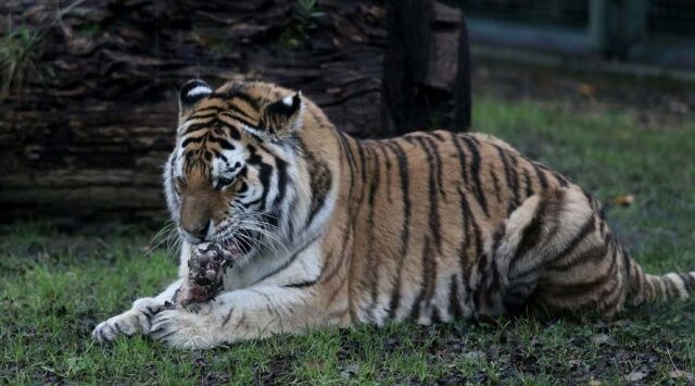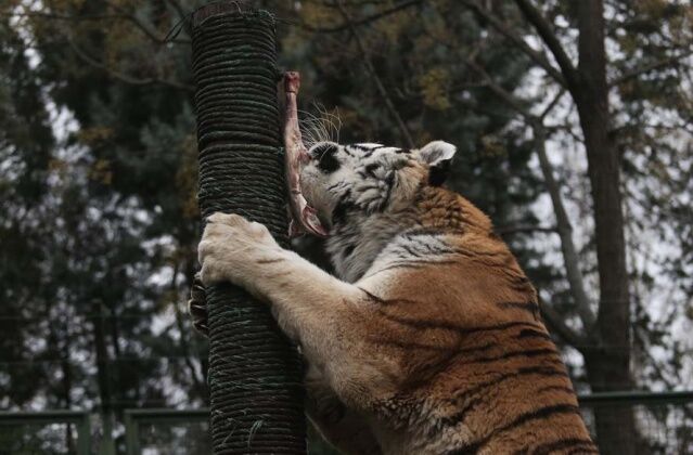 Direğin üzerine bakıcısı tarafından asılan etin kokusunu alan amur kaplanı, gözüne kestirdiği eti tek hamlede kaptı. Afiyetle etini yiyen kaplan, bu egzersizlerle ormanda yaşamış gibi zinde ve çevik kalıyor.