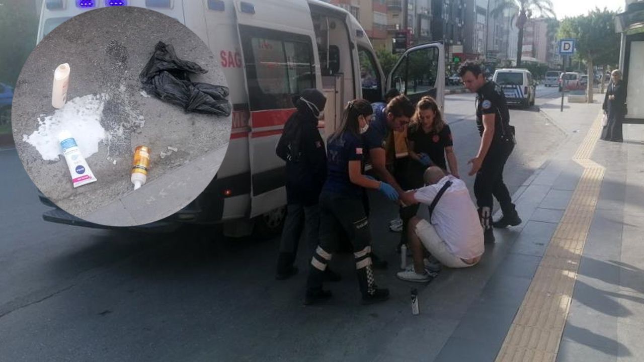 Şahsın oturduğu yerde bulunan boş şişe ve kutulardan, şampuanın yanı sıra tıraş kremi, deodorant ve güneş yağı da içtiği belirlenirken, polis ekipleri olay yerine ambulans istedi.