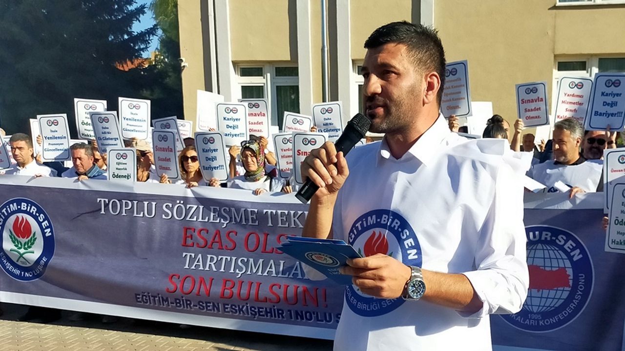 Eskişehir İl Milli Eğitim Müdürlüğü önünde düzenlenen basın açıklamasında Eğitim-Bir-Sen Eskişehir 1 Nolu Şube Başkanı İbrahim Akar şunları söyledi;